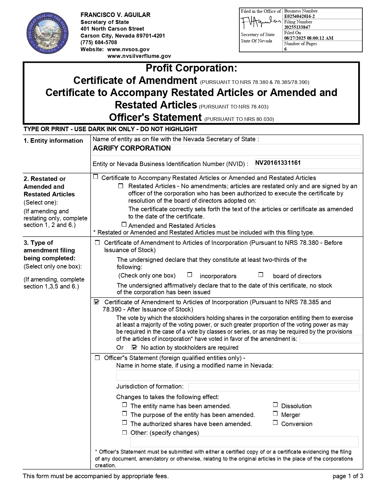 Name of entity as on file with the Nevada Secretary of State : AGRIFY CORPORATION Entity or Nevada Business Identification Number (NVID) : NV20161331161 1. Entity information Certificate to Accompany Restated Articles or Amended and Restated Articles Restated Articles - No amendments; articles are restated only and are signed by an officer of the corporation who has been authorized to execute the certificate by resolution of the board of directors adopted on: The certificate correctly sets forth the text of the articles or certificate as amended to the date of the certificate. Amended and Restated Articles * Restated or Amended and Restated Articles must be included with this filing type. 2. Restated or Amended and Restated Articles (Select one): (If amending and restating only, complete section 1, 2 and 6.) Certificate of Amendment to Articles of Incorporation (Pursuant to NRS 78.380 - Before Issuance of Stock) The undersigned declare that they constitute at least two - thirds of the following: (Check only one box) incorporators board of directors The undersigned affirmatively declare that to the date of this certificate, no stock of the corporation has been issued 3. Type of amendment filing being completed: (Select only one box): (If amending, complete section 1,3,5 and 6.) Certificate of Amdment to Articles of Incorporation (Pursuant to NRS 78.385 and 78.390 - After Issuance of Stock) The vote by which the stockholders holding shares in the corporation entitling them to exercise at least a majority of the voting power, or such greater proportion of the voting power as may be required in the case of a vote by classes or series, or as may be required by the provisions of the articles of incorporation* have voted in favor of the amendment is: Or No action by stockholders are required Officer"s Statement (foreign qualified entities only) - Name in home state, if using a modified name in Nevada: Jurisdiction of formation: Changes to takes the following effect: The entity name has been amended. Dissolution The purpose of the entity has been amended. Merger The authorized shares have been amended. Conversion Other: (specify changes) * Officer's Statement must be submitted with either a certified copy of or a certificate evidencing the filing of any document, amendatory or otherwise, relating to the original articles in the place of the corporations creation. FRANCISCO V. AGUILAR Secretary of State 401 North Carson Street Carson City, Nevada 89701 - 4201 (775) 684 - 5708 Website: www.nvsos.gov www.nvsilverflume.gov Profit Corporation: Certificate of Amendment (PURSUANT TO NR78.380 & 78.385/78.390) Certificate to Accompany Restated Articles or Amended and Restated Articles (PURSUANT TO NRS 78.403) Officer's Statement (PURSUANT TO NRS 80.030) TYPE OR PRINT - USE DARK INK ONLY - DO NOT HIGHLIGHT Business Number E0254042016 - 2 Filed in the Office of Secretary of State State Of Nevada Filing Number 20255133847 Filed On 08/27/2025 08:00:12 AM Number of Pages 6 This form must be accompanied by appropriate fees. page 1 of 3