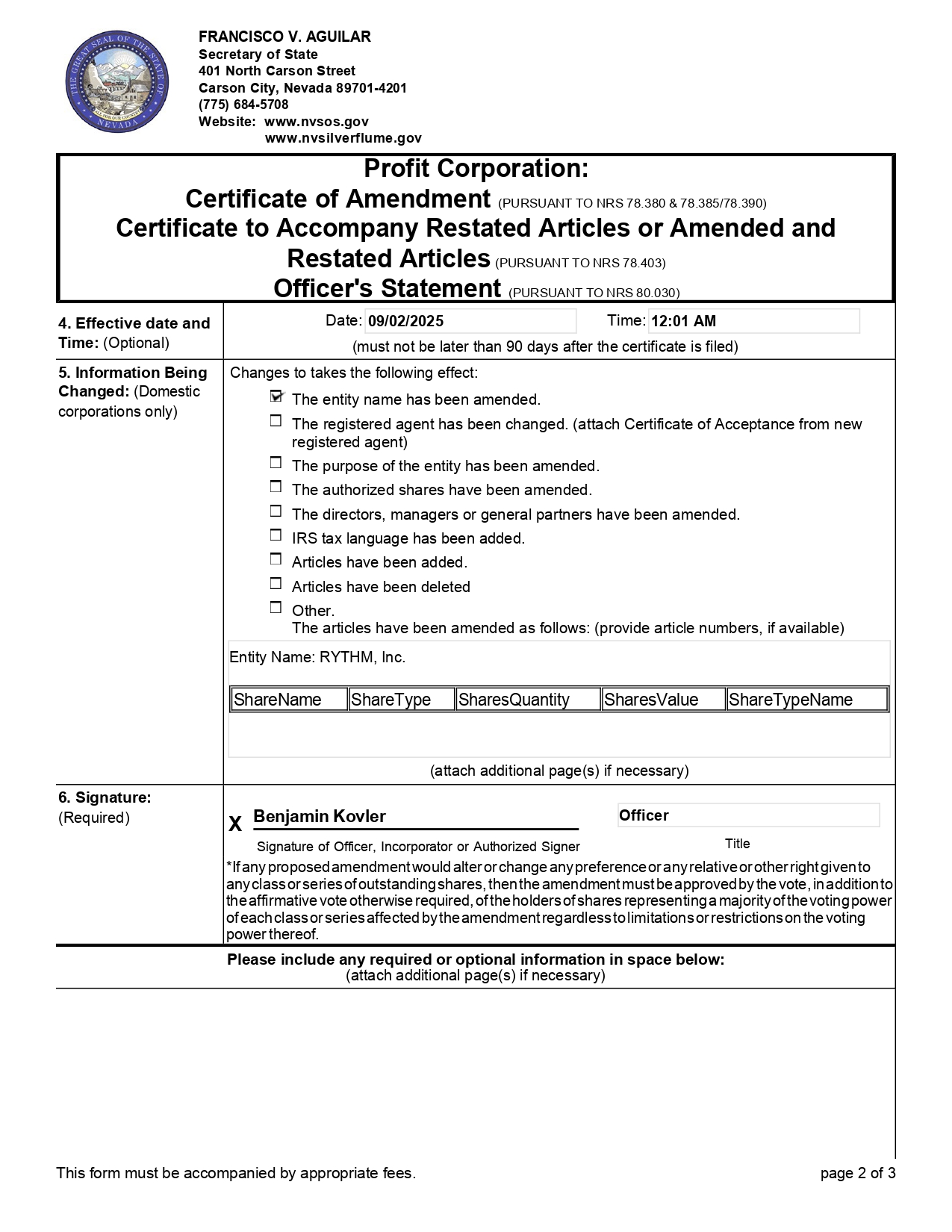 Entity Name: RYTHM, Inc. ShareTypeName SharesValue SharesQuantity ShareType ShareName Date: 09/02/2025 Time: 12:01 AM (must not be later than 90 days after the certificate is filed) 4. Effective date and Time: (Optional) Changes to takes the following effect: The entity name has been amended. The registered agent has been changed. (attach Certificate of Acceptance from new registered agent) The purpose of the entity has been amended. The authorized shares have been amended. The directors, managers or general partners have been amended. IRS tax language has been added. Articles have been added . Articles have been deleted Other . The articles have been amended as follows : (provide article numbers, if available) (attach additional page(s) if necessary) 5. Information Being Changed: (Domestic corporations only) X Benjamin Kovler Officer Signature of Officer, Incorporator or Authorized Signer Title *If any proposed amendment would alter or change any preference or any relative or other right given to any class or series of outstanding shares, then the amendment must be approved by the vote, in addition to the affirmative vote otherwise required, of the holders of shares representing a majority of the voting power of each class or series affected by the amendment regardless to limitations or restrictions on the voting power thereof. 6. Signature: (Required) Please include any required or optional information in space below: (attach additional page(s) if necessary) FRANCISCO V. AGUILAR Secretary of State 401 North Carson Street Carson City, Nevada 89701 - 4201 (775) 684 - 5708 Website: www.nvsos.gov www.nvsilverflume.gov Profit Corporation: Certificate of Amendment (PURSUANT TO NRS 78.380 & 78.385/78.390) Certificate to Accompany Restated Articles or Amended and Restated Articles (PURSUANT TO NRS 78.403) Officer's Statement (PURSUANT TO NRS 80.030) This form must be accompanied by appropriate fees. page 2 of 3